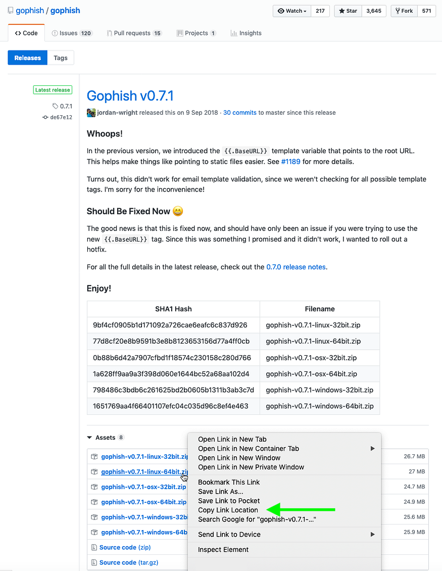 Una vez que inicie sesión en la instancia a través de ssh, necesitaba descargar un paquete binario para Gophish. En el navegador de mi computadora portátil, fui a la página de lanzamientos de Gophish en GitHub y encontré la URL de la distribución de Linux de 64 bits haciendo clic con el botón derecho (la experiencia de su navegador puede diferir ligeramente).