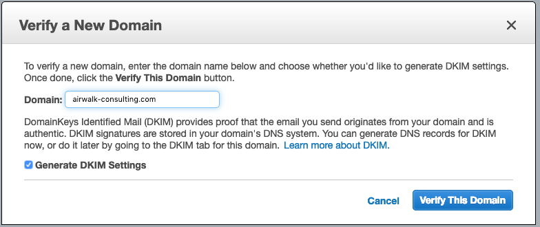 En la consola SES, elegí Verificar un nuevo dominio , agregué mi dominio y elegí generar una nueva configuración de DKIM:
